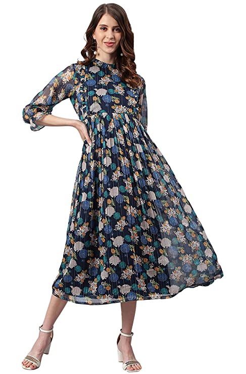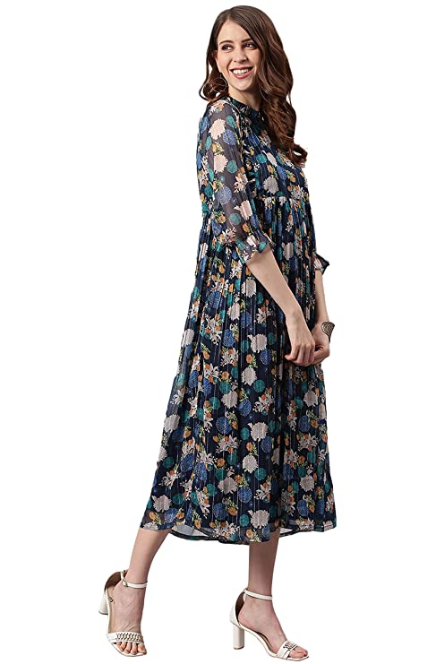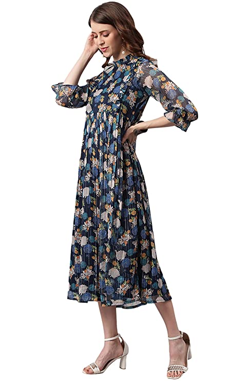Premium Collection by Janasya. This floral printed poly georgette dress from Janasya will make a great addition to any wardrobe. With ruffles on high neck and princess line this flared dress has all the charm you need for getting that perfect look. When you need an outfit for work and dinner after work, wear this puff sleeve piece with platform heels and some minimalistic jewellery.
