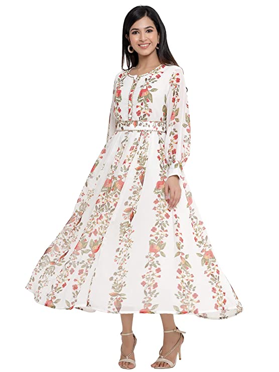EthnicJuniper Offwhite Chiffon Printed Flared Dress with Waist Tie-up