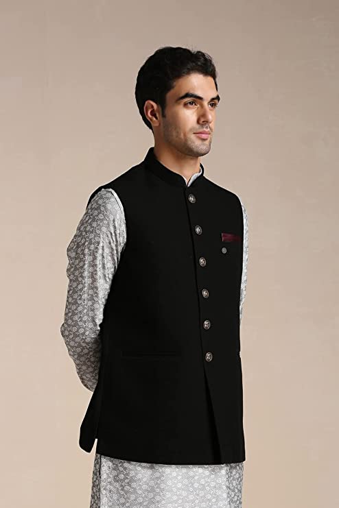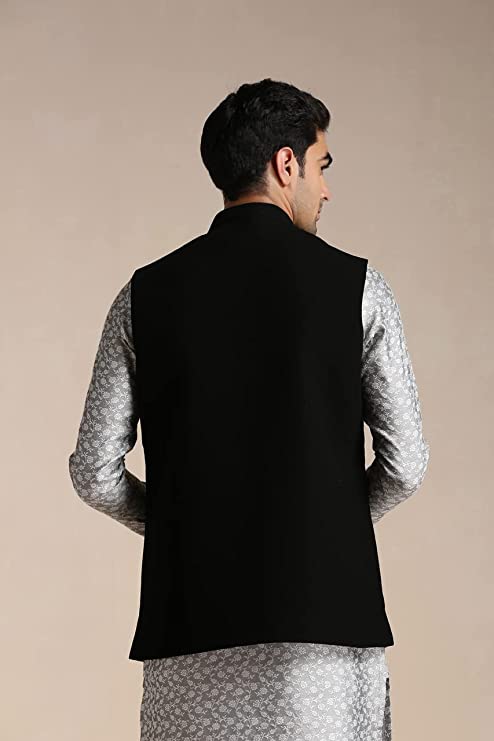 Love contrasts in ethnic outfits? Manyavar brings to you this colour shade jacket that perfectly compliments dark colored kurta set. Try this piece now.