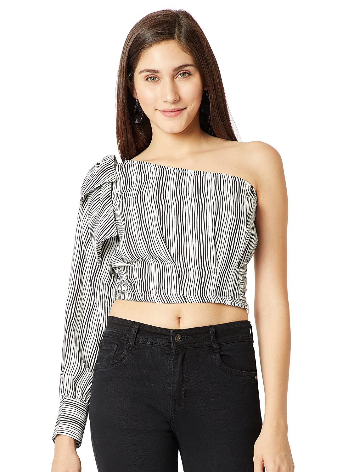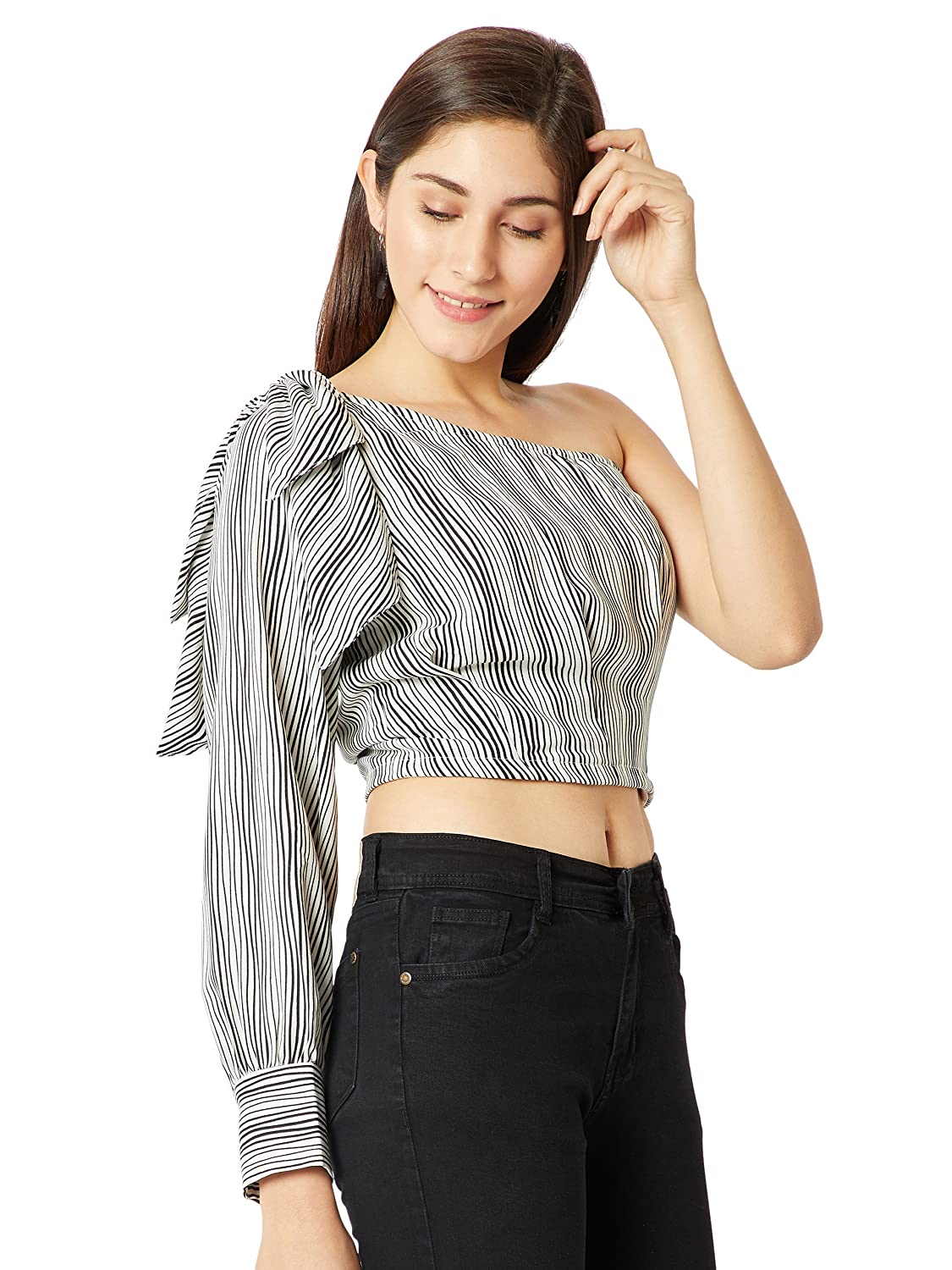 This floral bow detailing cuff sleeves one shoulder crop top, Is full sleeves and has a zip closure