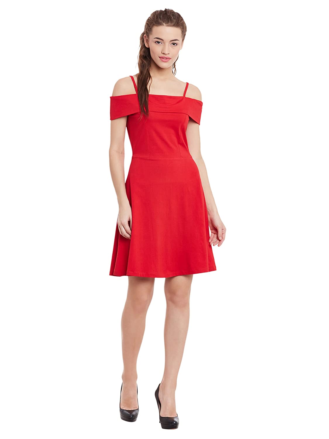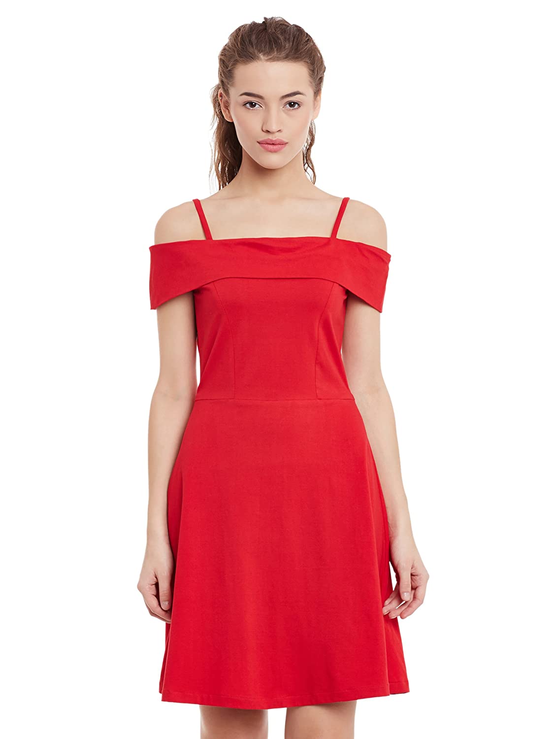 This knitted cotton solid mini Bardot style mini skater dress, Is sleeveless and has an off shoulder, Has spaghetti strap detailing