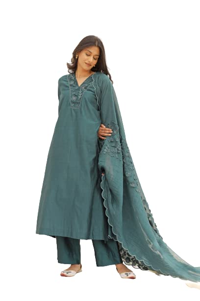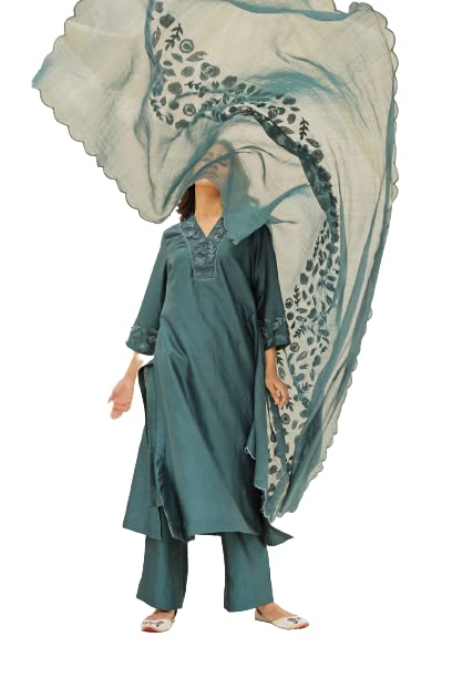 This is Neelu Sethi’s Designer Teal green floral print dress . its a kurta palazzo set with a matching dupatta . Kurta of this dress is of pure chanderi fabric with relaxed fitting and 3/4 th sleeves. It has a v – neck and shantoon lining , the kurti is below knee length. It comes along with cut work embroidery and beadwork. Topped with beautiful dupatta and matching teal green palazzo. The dress is a set of 3 . Its a complete set , best suited for all types of events , family get togethers and festivals. Make your casual meets , parties , festivals and all get togethers with your family more adorable with our ethnic yet so chic and stylish dresses.