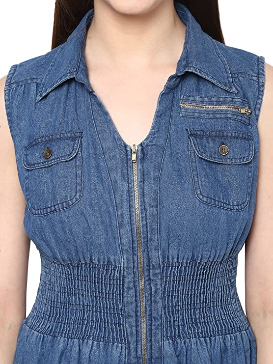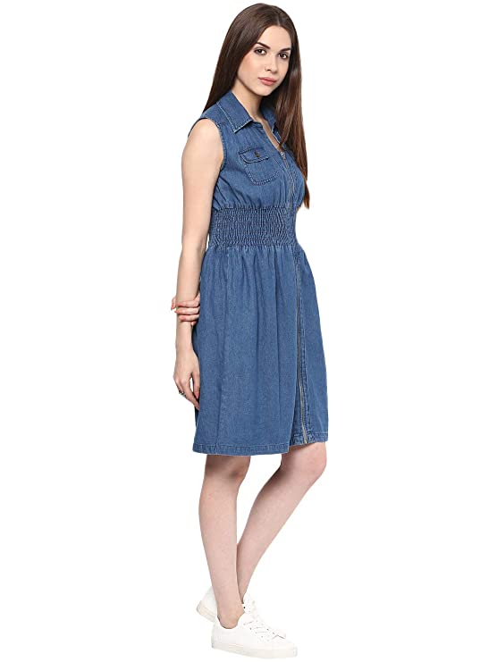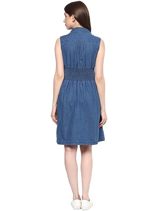 StyleStone Women’s Denim Knee Length Zip Dress with Smocked Waistline