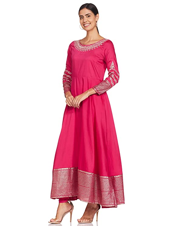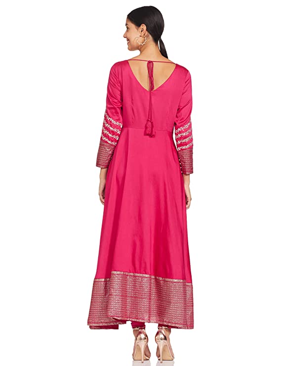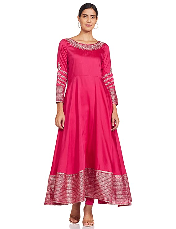 Indo-western light festive dress in panelled body detail and round neck with button closure. It also features metallic embroidery and gives a regular fit to you.